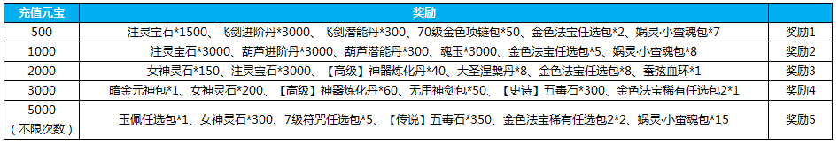 1、活动奖励3000元宝档次可以重复领取,其他均只能领取1次