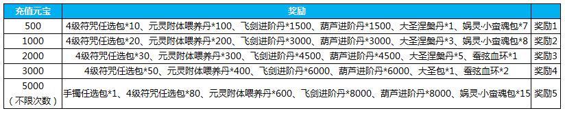 1.活动期间累计充值100元宝,送飞剑进阶丹*300,葫芦进阶丹*300,飞剑潜能丹*150,试炼令牌*50,2级秘文任选包*5