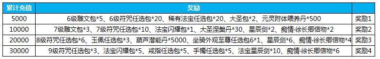 4、小伟在活动期间累计充值划账30000元宝,则可获得【奖励1】+【奖励2】+【奖励3】+【奖励4