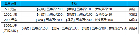 2、小刘在活动期间累计充值划账2000元宝,则可获得【奖励1】+【奖励2】+【奖励3】