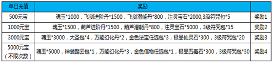 4)活动期间累计充值1000元宝,送飞剑进阶丹*1288,葫芦进阶丹*1288,刷新令*40,