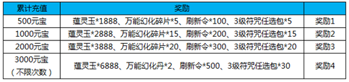 3、小于在活动期间累计充值划账2000元宝,则可获得【奖励1】+【奖励2】+【奖励3】