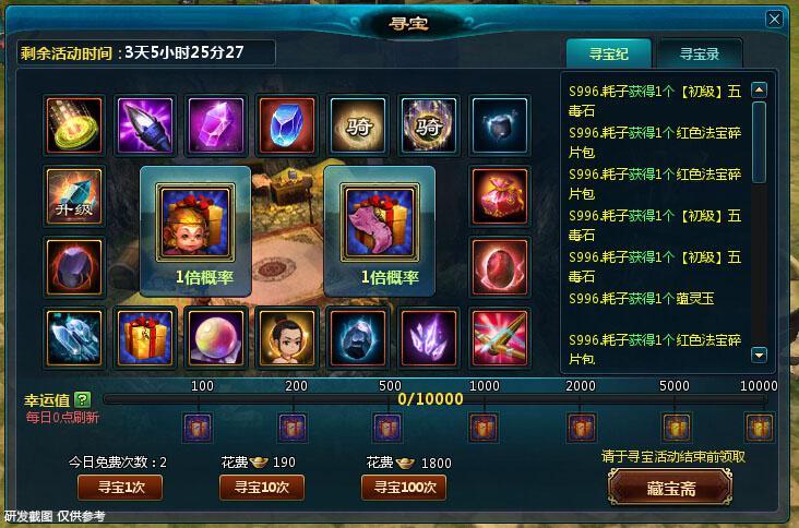 3)每位玩家每天可免费寻宝2次,可花费元宝寻宝,可连续寻宝10次或者100次。