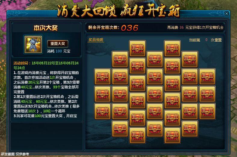 2)活动期间内玩家可花费100元宝重置大奖,开启宝箱后将无法重置大奖。