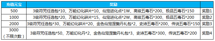 累计充值送3级符咒任选包、万能幻化丹、仙宠进化点等极品道具,小伙伴们千万不要错过哦!