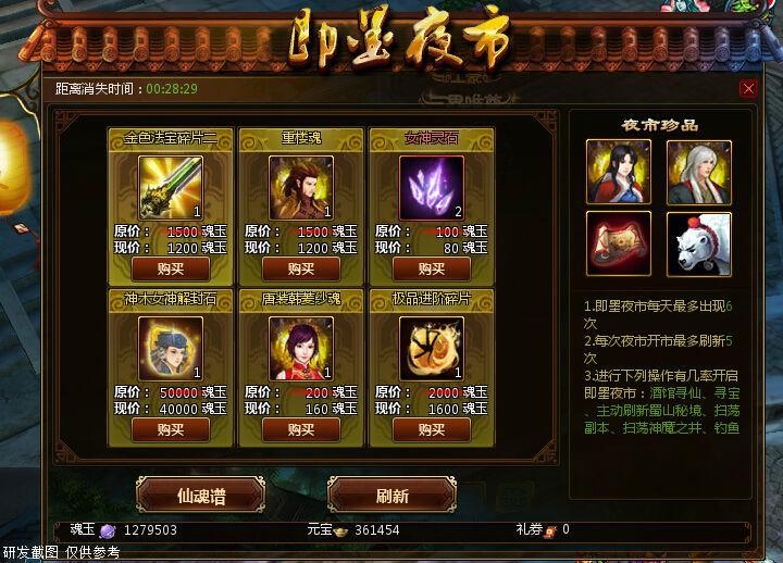 注:即墨夜市每次开启只持续30分钟,在即墨夜市开启的时间内以上操作不会再次触发开启即墨夜市。每天最多开市6次,可花费元宝刷新即墨夜市中出售的物品,每次开市最多可刷新5次。