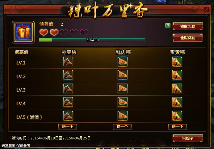 1)制作粽子后进行赠送可以增加倾慕值。达到一定的倾慕值等级可以领取相对应的奖励。