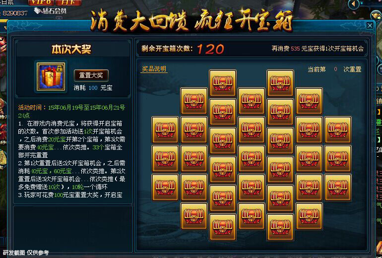 2)活动期间内玩家可花费100元宝重置大奖,开启宝箱后将无法重置大奖。